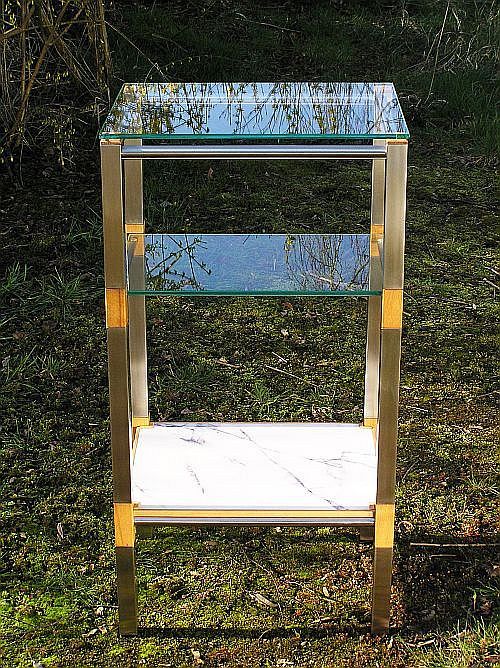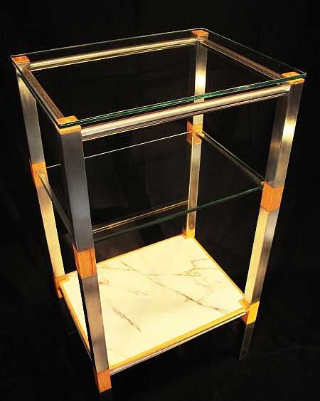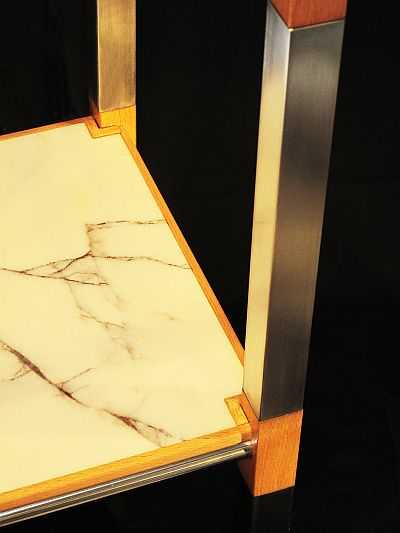 Polierter Edelstahl, Buche massiv, Marmorplatte + Glasplatten